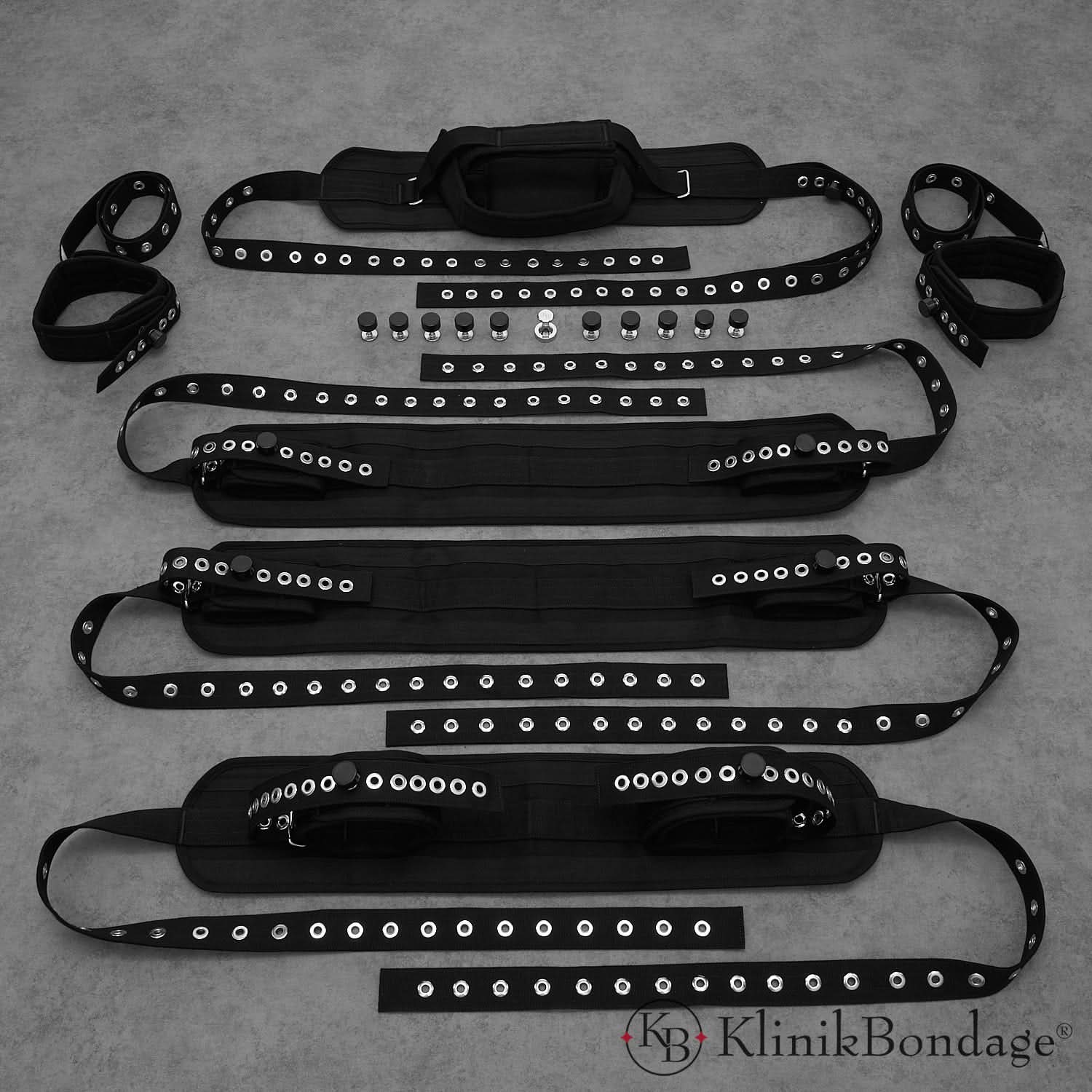 The 9-Point Bed Restraint Set in sleek black offers total restraint for ultimate control and intense anticipation during every bondage session. Designed to securely immobilize the head, arms, legs, hands, and feet, this comprehensive system creates a truly immersive experience.