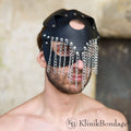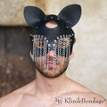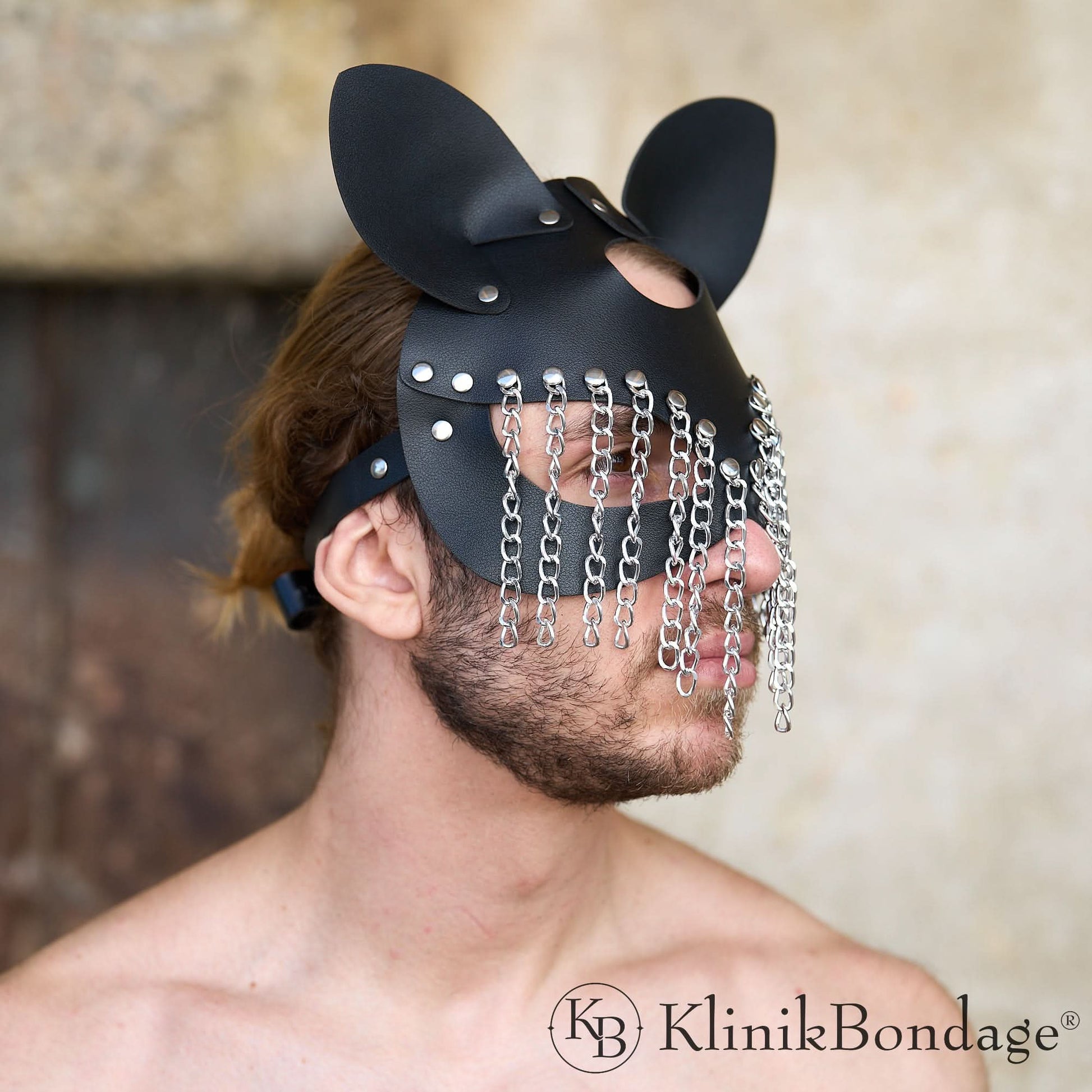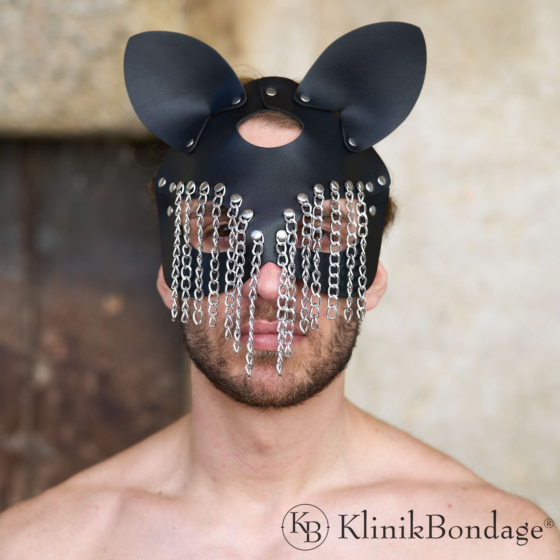 This premium leather BDSM mask features chains draped over the eyes for a sexy, mysterious look. Perfect for intense role-play and as a fetish outfit accent at kinky parties. Unisex design—fold-back ear panels add a masculine edge when desired.