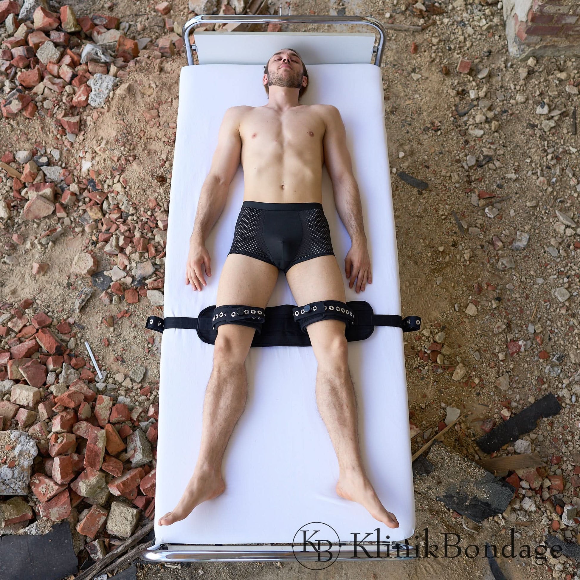 Our bondage gear works with all bed types—frame, slats, or simply tucked under the mattress. Cuffs are flexible to fit various setups. Depending on your bed size, additional straps may be required. See technical drawing and measurements in the product images.
