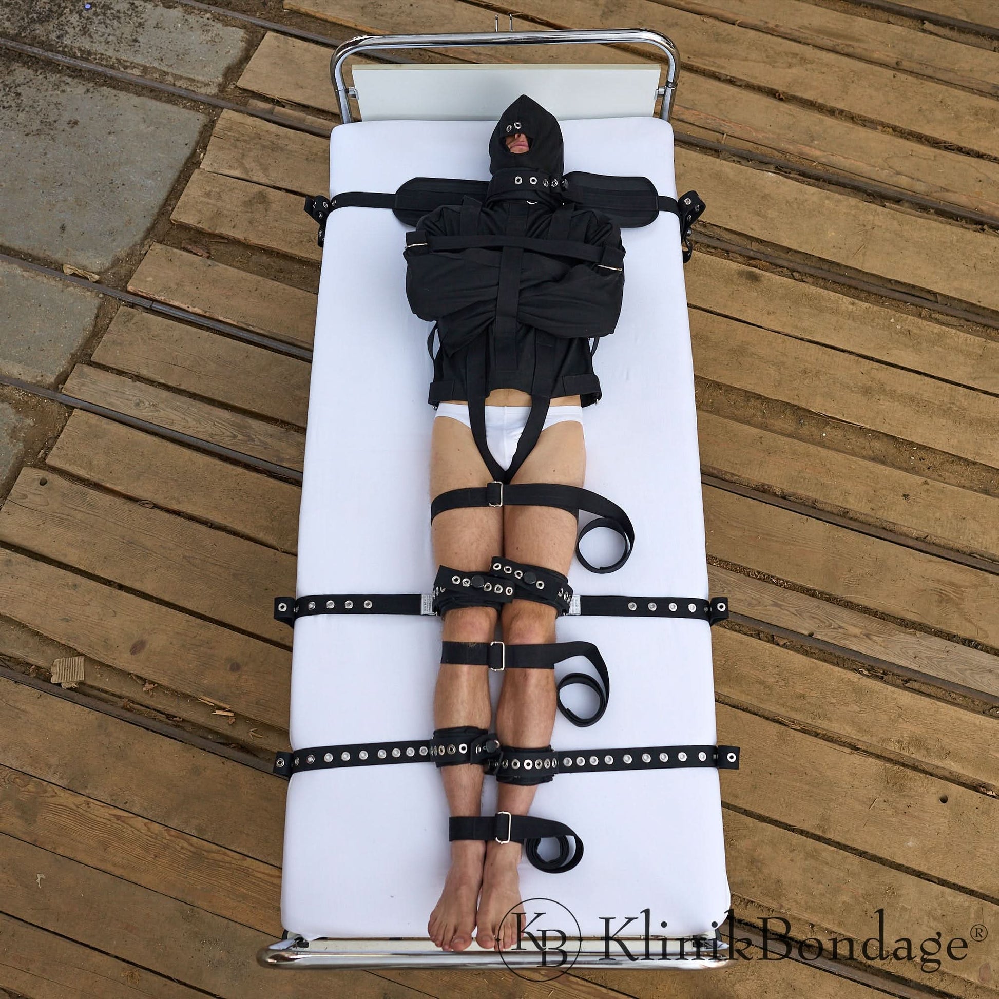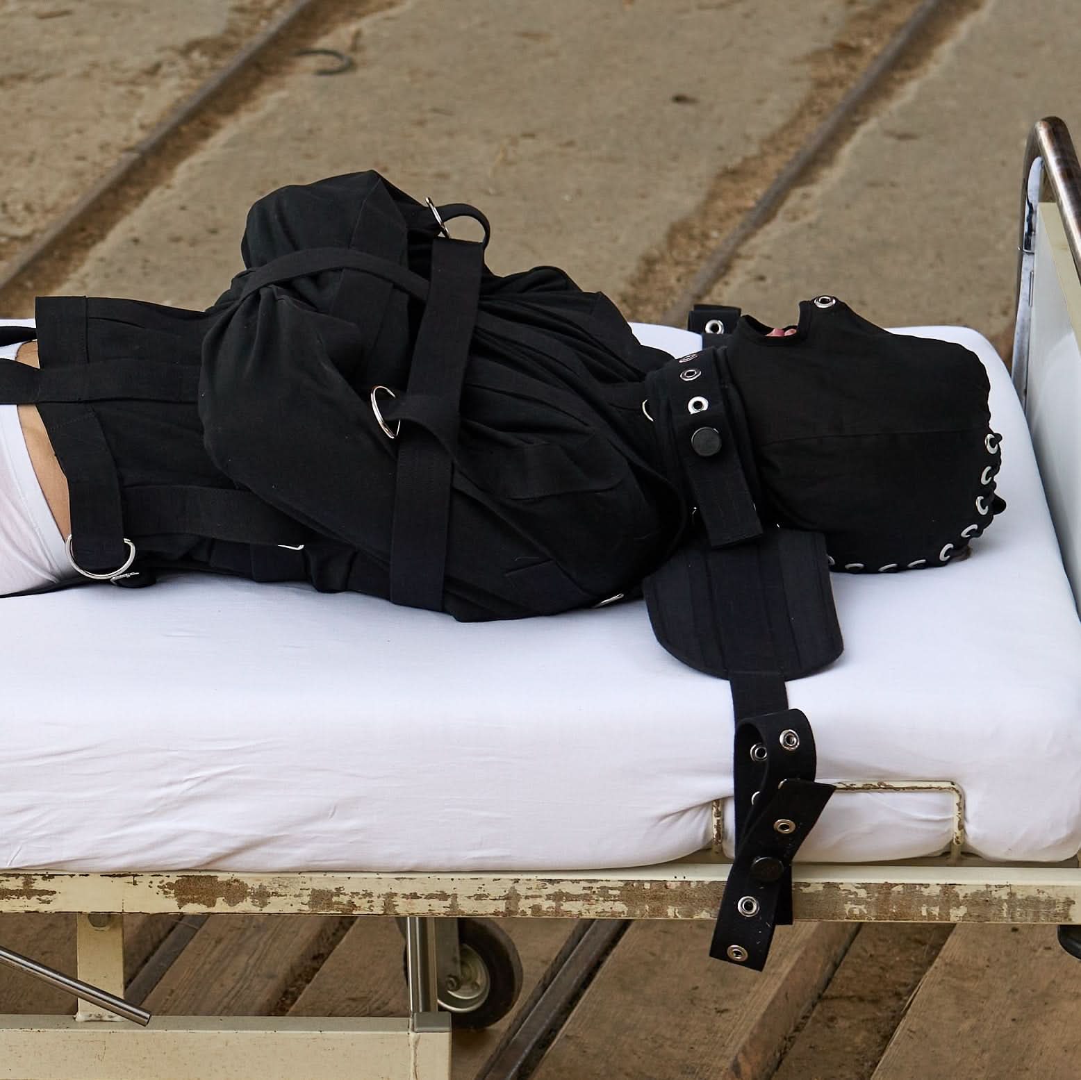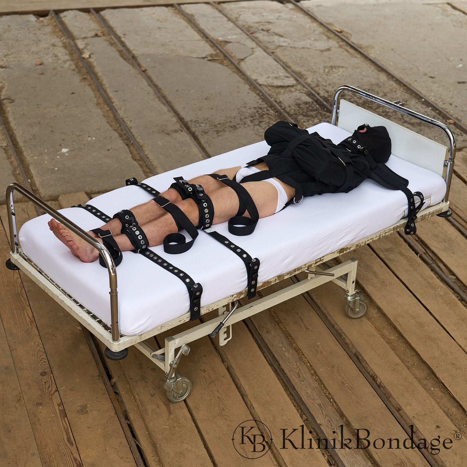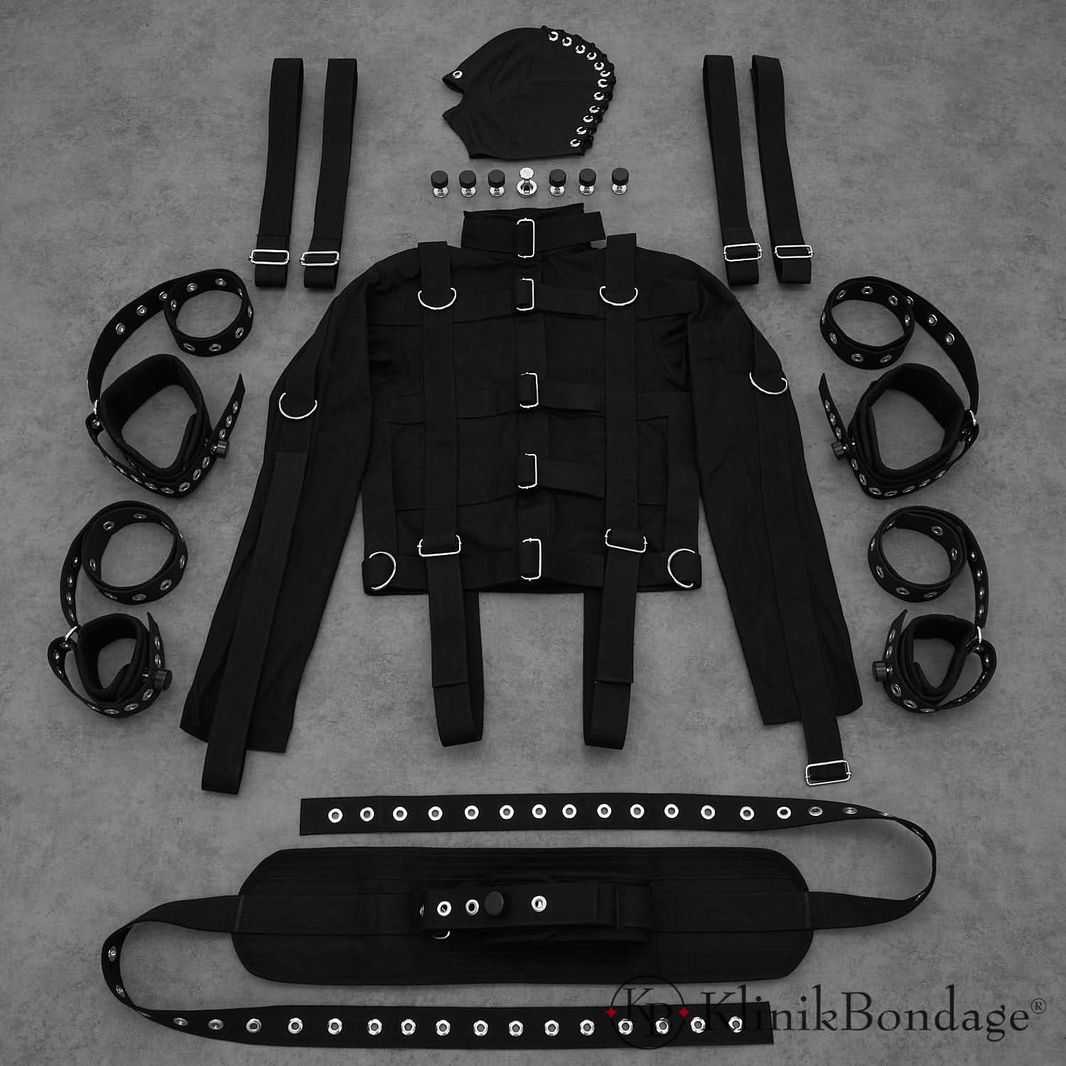 An additional strap is included for the straitjacket, which runs over the arms and secures them in specially designed loops. This strap prevents the arms from being lifted and is shown in the product images.