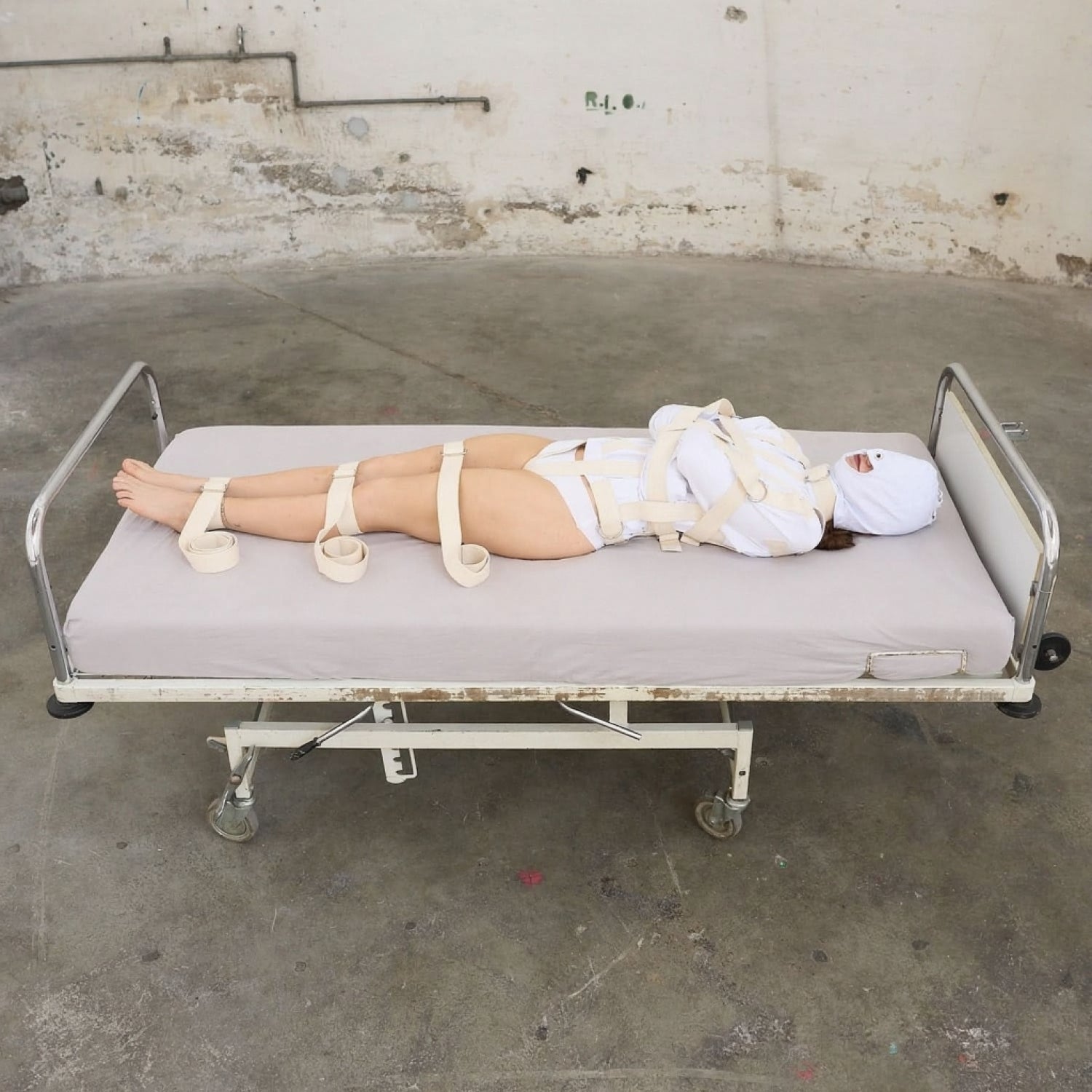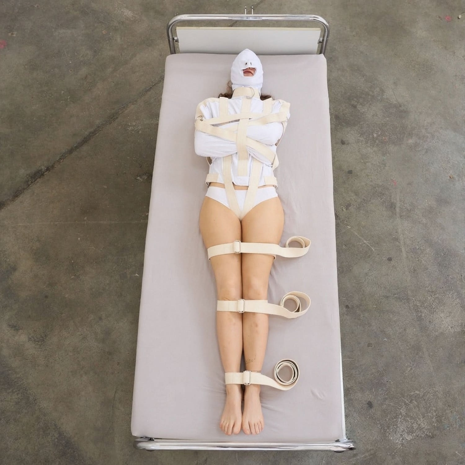 An additional strap is included for the straitjacket, which runs over the arms and secures them in specially designed loops. This strap prevents the arms from being lifted and is shown in the product images.